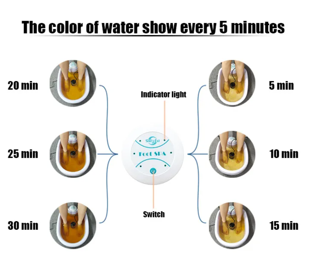 Portable round foot bath device designed for at-home relaxation and wellness, combining ion therapy with soothing massage to help relieve fatigue, improve circulation, and promote overall foot health.